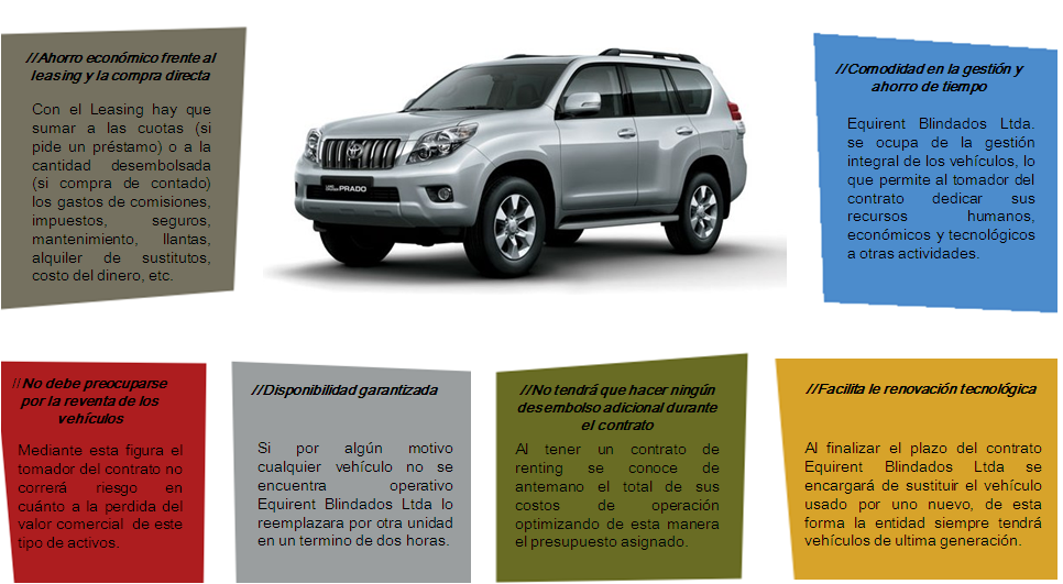 *Ausencia de riesgos económicos y operativos. *Garantía de disponibilidad 100% incluyendo vehículos de reemplazo. *Reposición tecnológica periódica. *Reducción y control de costos. *No es necesario realizar un desembolso inicial para recibir el o los vehículos. *Mejora el flujo de caja. *Al ser un gasto es totalmente descontable de la base del imporenta *No tiene que ocuparse de la venta futura del vehículo. *Se olvida del mantenimiento preventivo y correctivo de los vehículos blindados así como del pago de impuestos y seguros. *Se protege contra la pérdida de valor tan acentuada en este tipo de vehículos. *Integra en una sola factura mensual los costos inherentes a la administración y operatividad de los vehículos blindados.